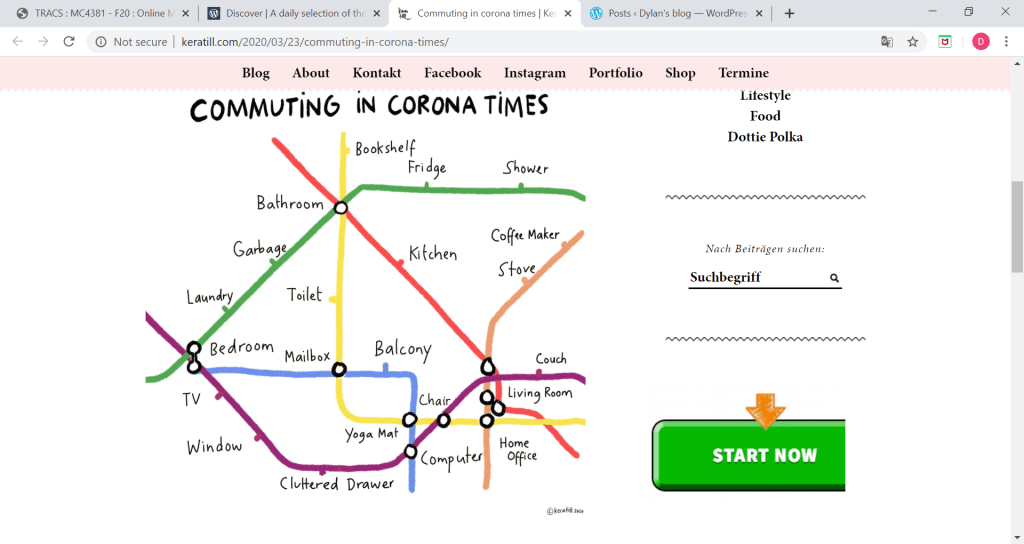 The blog by Kera Till details her daily commute around the house during her isolation period. This blog differs from other blogs about the struggles of living in Covid-19 society due to the fact it consists of her own artwork rather than the usual paragraphs written by bloggers. The map uniquely describes just how bored Till probably is if she has the ability to perfectly depict the routine she has mastered while under quarantine. With outside distractions like sports and other events being cancelled around the world, people are having to learn new ways to entertain themselves during these tough times. Till is portraying how she has been able to pass the time by organizing a solid structure for her every day activities. For example, exercise equipment is over by the yoga mat, computer is in/by the home office away from the television and the coffee maker is near the bookshelf for better reading engagement. All these factors are grafted onto the art piece and do wonders to illustrate the life of Kera Till. Also, the piece embodies the lives of other individuals as well who are facing the same particular struggle. Most living spaces are similar to what the blog describes and do to that, many people can relate to the point that is being made by Till. With 122,653 coronavirus cases and 2,112 deaths in the United States and rising, self isolation is the key detriment to the spread of the deadly virus. Therefore, it’s extremely important for citizens to listen to bloggers like Kera Till and stay inside. Draw a map of your daily routine and the various utilities inside the household if you have to but make sure to avoid close contact with other people. In conclusion, Kera Till sends an important message to the community through her art piece and her blog by showing how she is self isolating. Keeping herself and those around her safe, an example everyone around the globe should follow.