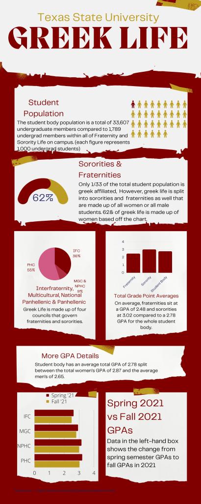 The past narrative about Greek Life has been everything but flattering towards students going to campus as undergrads looking for social outlets during the semester. Through Dudolski’s efforts to revamp the stigma past organizations have left on the remaining Greek groups, the university has seen positives come out of joining these brotherhoods/sisterhoods. The consistent theme of the data shows that the accountability fraternities and sororities hold their members to, lead to above average showings in total GPA averages. According to the Texas State University Fraternity Sorority Life website, in the fall of 2021, students with membership amongst recognized groups had higher GPAs compared to unaffiliated students. The combined averages of all Greek Life organizations were .03 grade points higher respectively, than the combined grades of the rest of the 33,607 members of the student body.